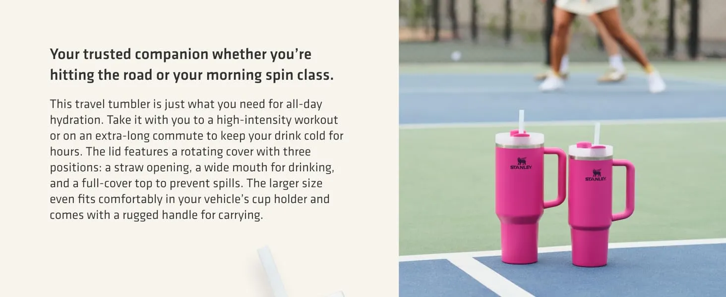 The Stanley Quencher H2.0 FlowState is more than just a tumbler—it’s a statement piece. With its sleek design and durable construction, it’s built to last and withstand daily use, whether you’re taking it to the gym, the office, or on an outdoor adventure. The tumbler features a wide-mouth opening for easy filling and cleaning, and the FlowState lid is designed to reduce spills and splashes, so you can enjoy your drink without worry.